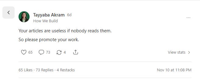 But ask them to leave a comment on another newsletter or post on Notes three times this week, and suddenly they’re too busy. They’ll write about vulnerability and authenticity but won’t promote their work because it feels icky. They want the results without doing the actual work that gets results.